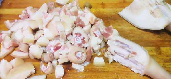 2、鍋中加入適量的清水,放入洗幹凈的豬尾巴,再倒入一點料酒,蔥花,薑片。用大火把鍋燒開,開鍋後,再撇去上面的浮沫,接著把豬尾巴撈出來,放入清水裡,洗去豬尾巴表面的油脂,我們將處理幹凈的豬尾巴切成小塊,這樣方便燉和吃。