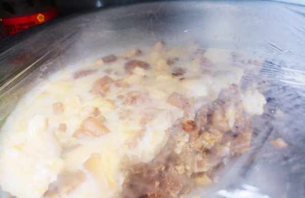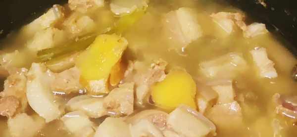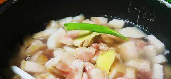 3、將高壓鍋裡放入適量的清水,把洗幹凈並且切好塊的豬尾巴放到高壓鍋裡,放點料酒,蔥段,薑片,蓋上蓋子,煮40分鐘。