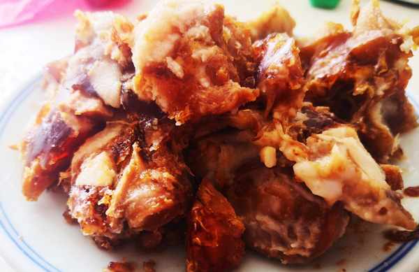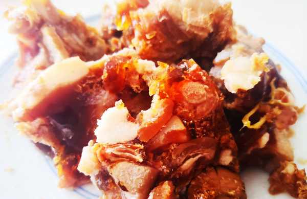等豬尾巴凍成型瞭,凝固到一起,我們就可以挖下來吃瞭,最上面的那層油脂,有些油膩我們可以撇去不吃,剩下的豬尾巴凍可以放入冰箱冷藏,隨吃隨拿。