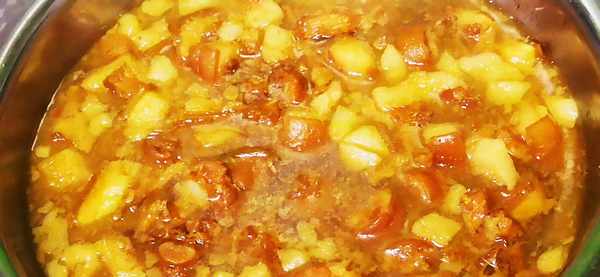 4、煮好後,將高壓鍋裡的豬尾巴倒出來放入鍋中,放入一點生抽,醬油,味極鮮,鹽,八角,大火把鍋燒開,再轉成中小火慢慢燉20分鐘。20分鐘後看著鍋中的湯汁有一點濃稠瞭就可以瞭,我們就把豬尾巴和湯汁盛出來放涼。