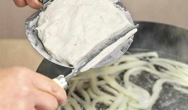 做刀撥面使用的大刀,是兩面都有把手的大寬刀,用它做出的面條,筋道十足。