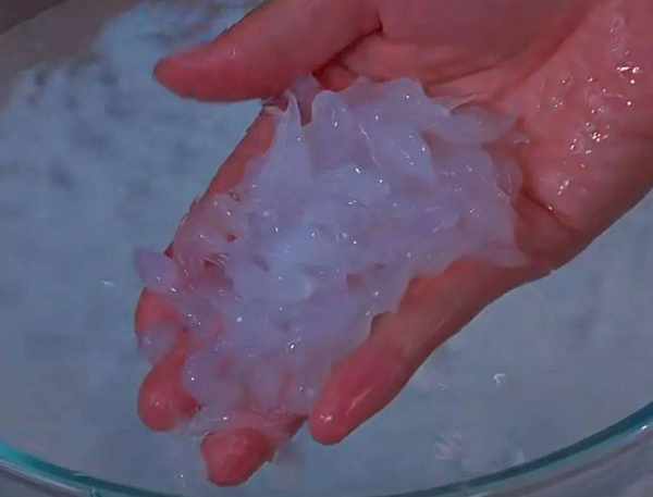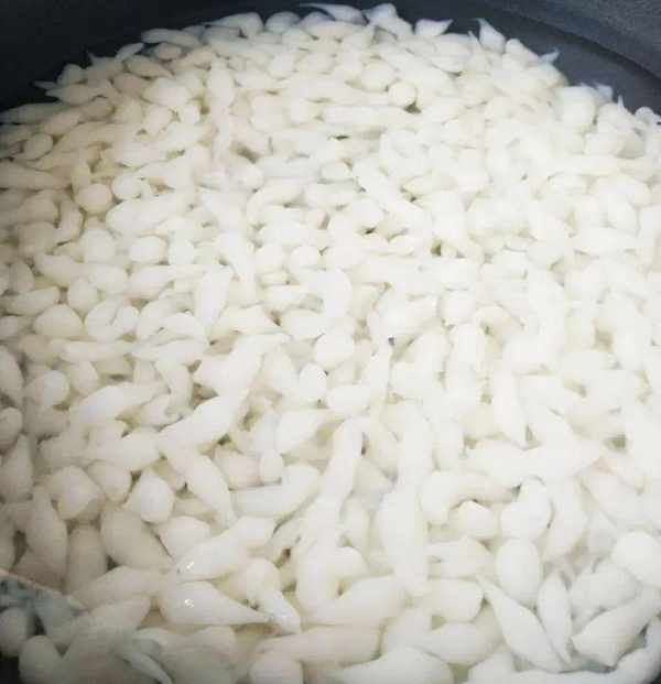 6、準備一個漏勺或者蒸籠層面,盆裡倒入大量的冰水,在盆子上面放上一個蒸籠,把剛剛煮好的面糊倒到蒸籠上,用鏟子輕輕按壓,把面糊從蒸籠的洞眼裡擠出去,讓擠出去的面糊落到下面盆中的冰水裡,落到冰水裡的面糊會凝固,像一個個小蝌蚪一樣,這樣涼蝦就做好瞭。