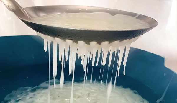 4、等到鍋中的清水沸騰之後,再轉成小火,把剛調好的淀粉水緩慢地倒入鍋中,一邊倒入時一邊用鏟子順著同一個方向快速攪拌均勻,剛下入鍋中熬煮的時候,鍋中的時尚呈現濃稠的白色糊狀,在這個時候還需要繼續熬煮兩三分鐘。