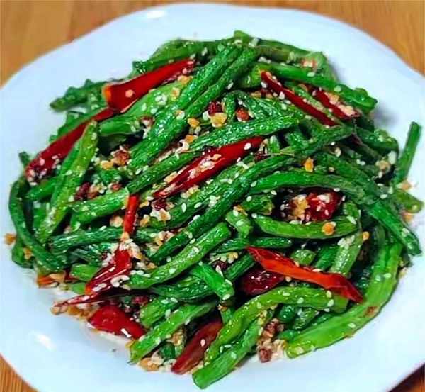 步驟三:起鍋燒油,下入蒜末、薑末、花椒、幹辣椒炒香,倒入炸好的豆角段,加入一勺鹽、雞精、適量的白糖調味,撒上一點熟芝麻,翻炒均勻即可出鍋。
