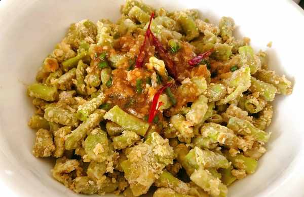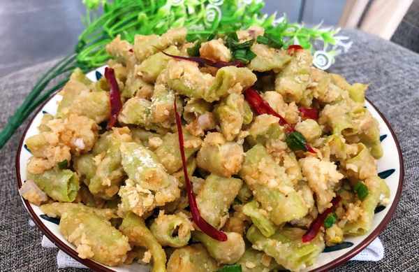 《食材》豆角一把、面粉適量、雞蛋1個、大蒜、蔥葉、辣椒、香油、雞精、生抽、鹽