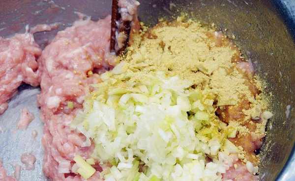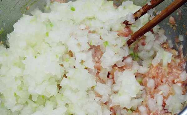 (4)冬瓜醃好後會出來很多水分,把水擠幹,擠好後和豬肉一起放到盆內,攪拌混合,冬瓜提前放瞭鹽,肉餡就不需要再放瞭
