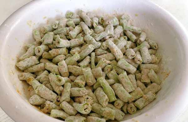 (2)準備一個雞蛋打散,接著將豆角倒入盆中加一勺面粉拌勻,然後少量多次地倒入雞蛋液,邊倒邊用筷子攪拌,再加入適量面粉拌勻,最後是這樣互相不粘連的狀態