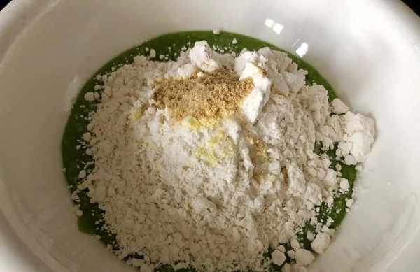 (3)倒入盆中,加適量鹽,五香粉,雞精調味,再分多次倒入面粉,一邊加一邊攪拌