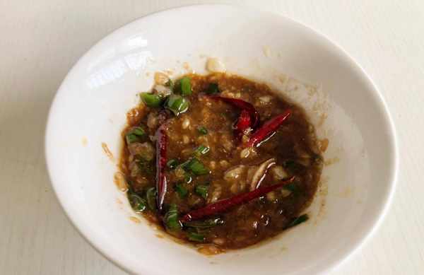 (4)準備1頭大蒜搗成蒜泥,加適量鹽,雞精,生抽,香油,陳醋,白糖調下氣質,切點蔥花辣椒放進去