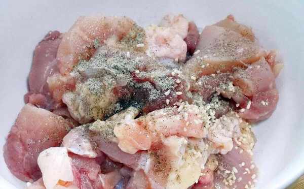(1)首先將雞腿剁成小塊,加清水,一勺鹽浸泡一會兒,然後清洗幹凈瀝幹水