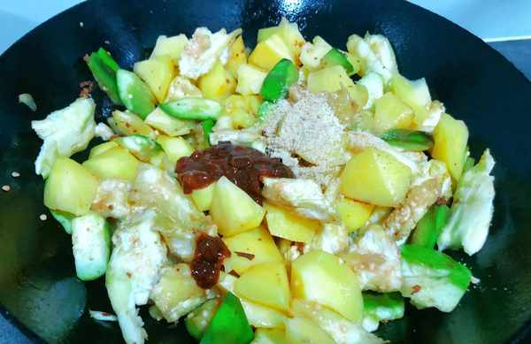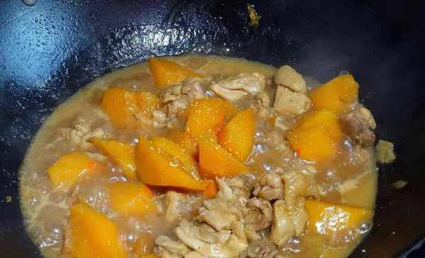 (5)最後倒入南瓜翻炒,加半碗水小火燜10分鐘,煮熟後放鹽,雞精調味,再加點老抽調色,就可以出鍋瞭