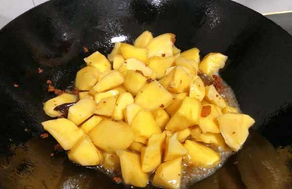 (3)鍋裡加一勺油,先放肉末炒至半熟,然後倒入土豆翻炒2分鐘