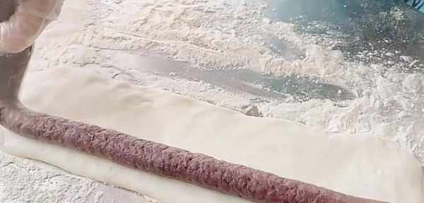 (5)面板上撒一層炒熟的糯米粉,放入糯米面團揉光滑,分割成4份來操作,取一份用搟面杖搟成長方形薄餅,中間擠上豆沙餡卷起來捏緊實,切成合適的大小