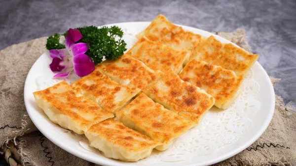 (6)平底鍋倒油,依次放入鍋貼小火慢煎,煎至底部金黃酥脆時,倒入少許清水,蓋上蓋子燜煮3分鐘,待鍋裡水燒幹就可以開吃瞭