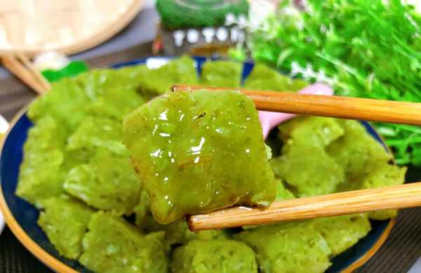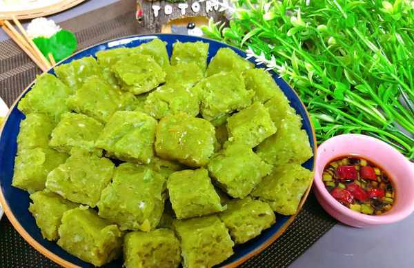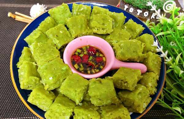 (7)蒸好的豆餅放到不燙手再取出來,切成小塊裝盤,搭配料汁,就可以上桌瞭,豌豆豆香味濃鬱,軟軟的,帶有豆子的顆粒感,越嚼越香