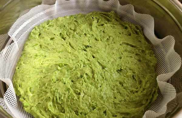 (5)蒸籠鋪好蒸佈,倒入豌豆糊攤開攤薄,涼水上鍋,水開後蒸20分鐘