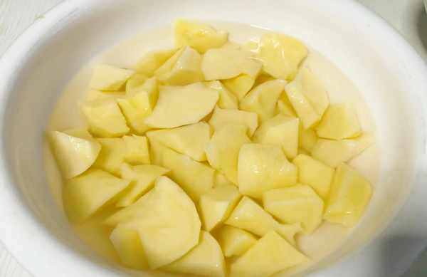 (2)然後準備倆去皮的土豆,用勺子剜成不規則塊狀,加水浸泡防止變黑