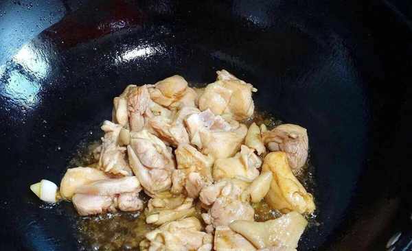 (4)鍋裡倒油,先放蔥薑蒜炒出香味,然後倒入醃制好的雞塊翻炒變色