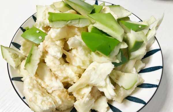 (1)首先把農傢的大青茄子洗幹凈,皮留著,用手撕成小塊或者條狀