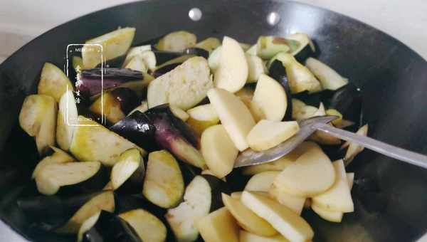 第三步,炒制。鍋中加入2勺食用油,油熱後先加入大蒜爆香,然後加入土豆炒至斷生,接著加入茄子炒制。