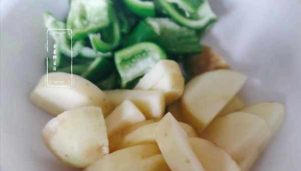 第二步,青椒土豆切塊。接著把青椒清洗幹凈,切成塊狀。土豆洗凈後去皮切片,再洗去淀粉。大蒜去皮拍碎備用。做完這些,茄子已經醃制出水,擠幹水分,加入1勺面粉拌勻,這樣醃制過的茄子,炒制後不會吸油。
