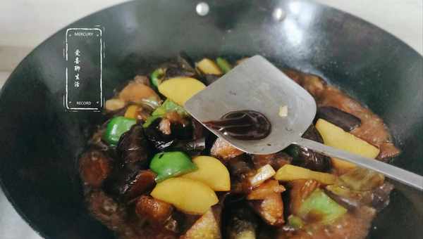 第四步,加入青椒。炒至茄子土豆都已經斷生變軟後,加入青椒一起翻炒均勻,然後加入生抽2勺,老抽1勺上色。