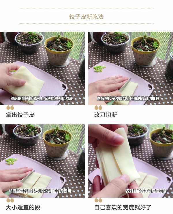 根據自己的喜好把餃子皮改刀,改至合適的寬度