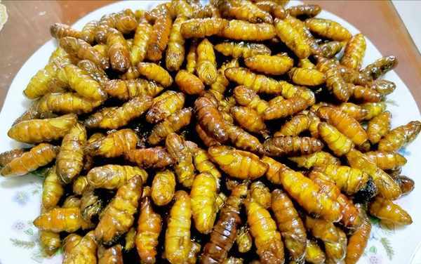 鍋內放入山茶油,油溫6成熱時,放入蠶蛹油炸至兩面金黃色時撈起,然後加入食用鹽拌勻,雖然蠶蛹的形狀讓人感到害怕,但卻是老一輩們最愛的一道下酒菜。