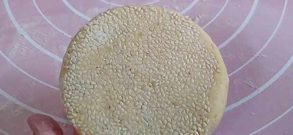 14.在表面蘸點清水,放到芝麻上,按扁。