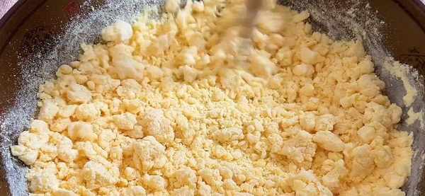 1.150克玉米面放入盆中,倒入150毫升開水,然後攪拌成顆粒狀,蓋上蓋子,燜10分鐘。