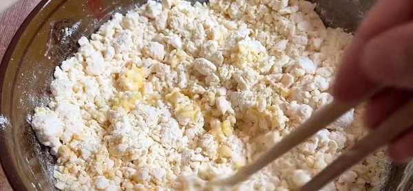 3.然後倒入200克的面粉,然後再加60毫升清水,攪拌成面絮狀。