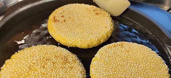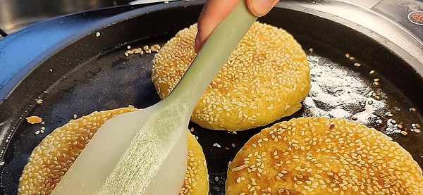 16.起鍋倒油,下入生坯,有芝麻那一面朝下。蓋上蓋子開小火烙。