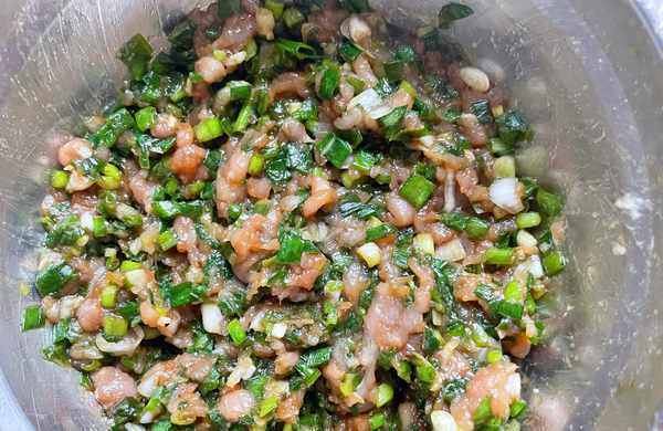 2.有的人喜歡蔥跟肉直接剁在一起,會更入味,我將兩者抓拌在一起,也能達到這個效果。