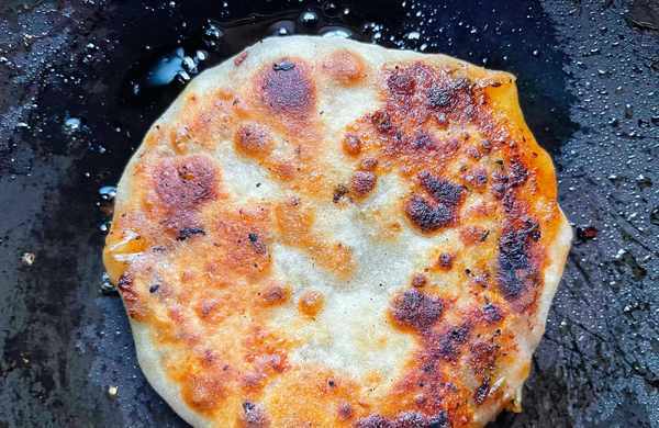 6.鍋中倒入適量食用油,放入面胚,小火煎制,翻動得勤快些,不要讓表面煎焦瞭就行,直到煎熟為止。