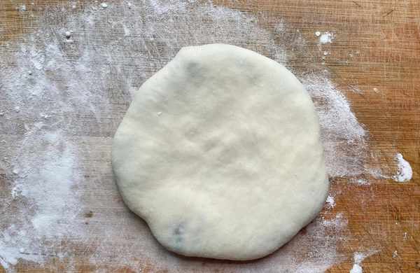 5.取出發酵好的面團,揉面排氣,然後切成等大的面劑子,搟面皮,中間厚一點,邊緣薄一點,像包包子一樣包好,再用手壓成圓餅狀。