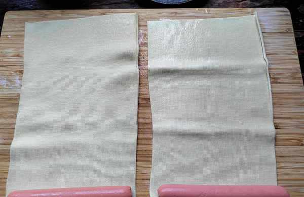 第四步:把豆腐皮沖洗一遍,對半切開,分別放上一根火腿腸,從一頭卷起,稍微卷得緊一些,避免散開。