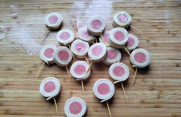第六步:用牙簽把切好的豆皮卷火腿腸串起來,串的時候要註意,牙簽從豆皮最後一端紮進去,這樣可以避免烤的過程中散開。