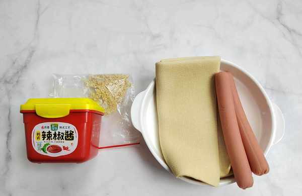 主料:豆腐皮1張;火腿腸兩根。