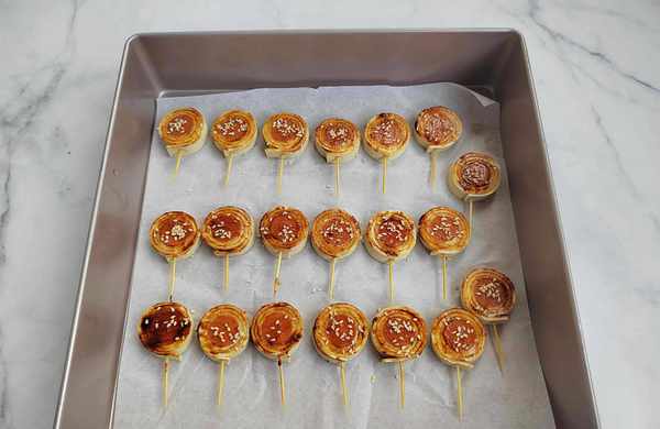 第七步:烤盤中墊一張油紙,更好清洗,也可以防粘。把串好的豆皮卷火腿腸,全部擺入烤盤中,刷上醬料,撒上熟芝麻,放入預熱好的烤箱中,上下火200度,烤10分鐘,中途可暫停烤箱,取出翻面,刷上醬汁,也可以兩面都刷上醬汁再烤,撒一些熟芝麻可以增加香味,沒有也可以不加。