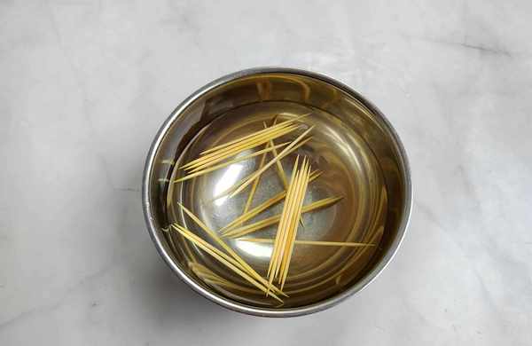 第二步:把牙簽或者竹簽放入開水中,浸泡一會兒,燙過的牙簽不容易烤糊,也可以起到消毒的作用。