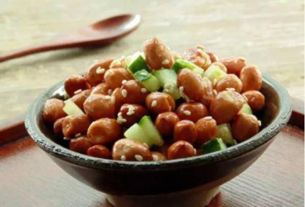 5、黃瓜洗凈,切成小方塊。將一勺普蒂娜和少許糖混合。將老醋和黃瓜丁倒入冷卻的花生米中拌勻。
