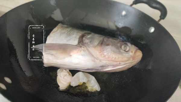 第二步,煎魚頭。半小時後,魚頭醃制得差不多瞭,把它拿出來,擦幹水分,炒鍋預熱,加入2勺食用油,再撒上少許食鹽,然後放入魚頭煎制。殺魚時有個魚泡也一起煎制。