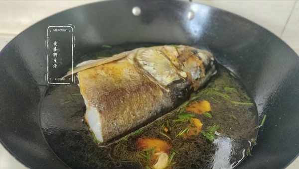 第三步,翻面。等魚頭的一面煎至金黃,晃動鍋底能動瞭,就可以翻面瞭。把另一面也煎至金黃,再做下一步操作。