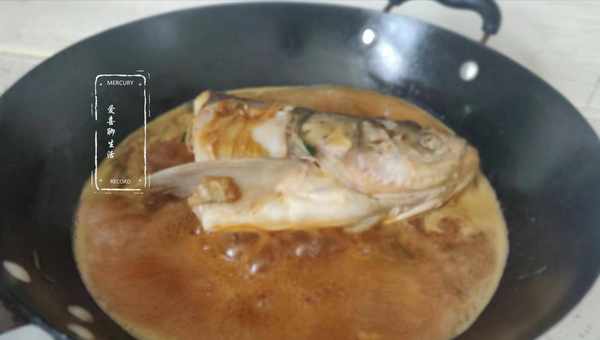 第五步,燜煮。燒開後,不要馬上轉小火,繼續大火煮5分鐘後,轉小火燜煮20分鐘,煮至皮爛肉酥,魚頭裡面也就熟瞭。