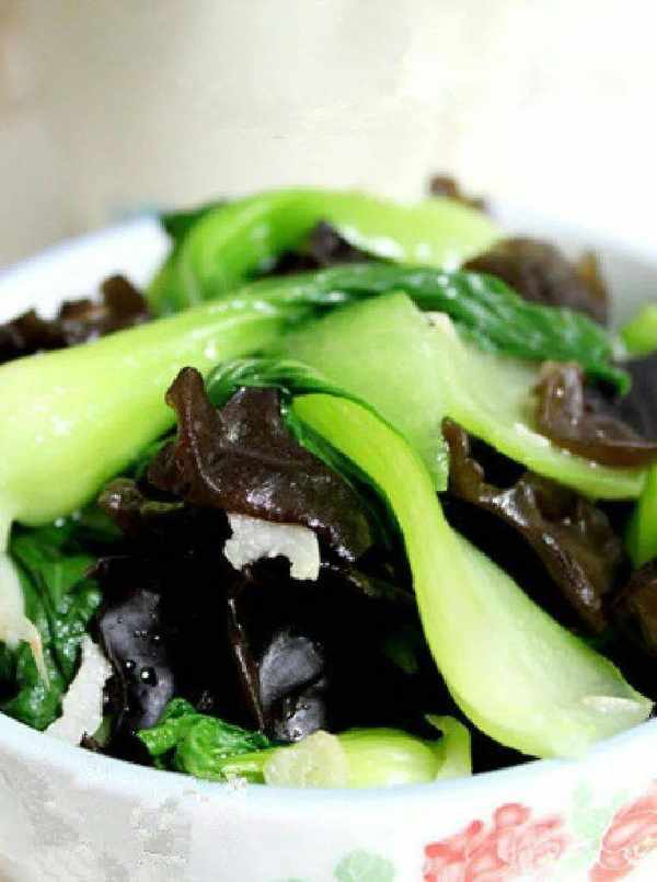 3 油鍋炒香蒜末和蝦米,放入木耳翻炒,再倒入油菜調味,拌勻即可。