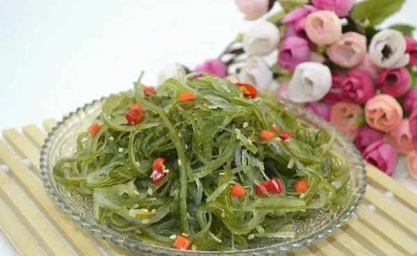 2 買來的裙帶菜,放入水中浸泡一天。裙帶菜洗凈,也切成粗的絲備用