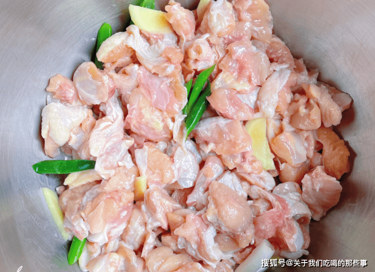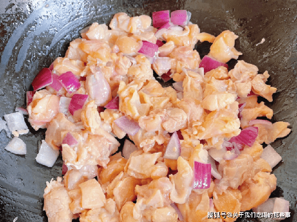 2、雞胸肉加入適量淀粉、食鹽、生抽、老抽、蠔油、黑胡椒粉、食用油,抓拌均勻後醃制20分鐘。起鍋燒油,倒入醃好的雞肉塊,小火翻炒至變色後盛出。