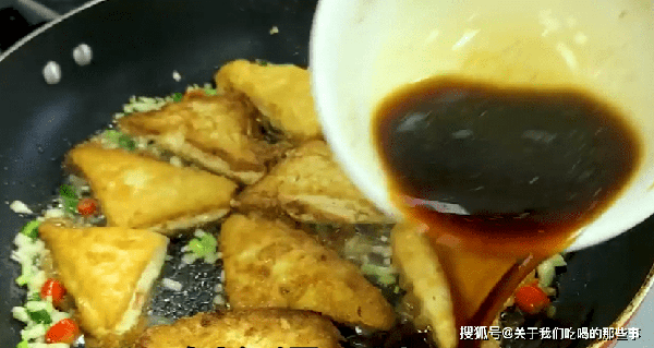 3、碗裡加入適量生抽、蠔油、白糖、胡椒粉、清水,用筷子攪拌均勻。起鍋燒油,放入蔥蒜末、小米椒爆香,放入煎過的豆腐,晃動鍋,倒入料汁,蓋上鍋蓋小火燜七八分鐘的樣子,最後撒上蔥花即可。