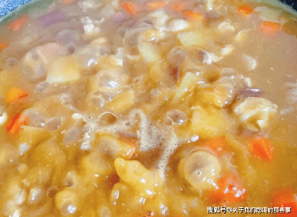 4、加入2塊咖喱,用鏟子不停地翻炒,直至咖喱全部溶解,湯汁濃稠後即可關火。把米飯盛入盤中,澆上剛剛炒好的咖喱雞肉,撒上黑芝麻點綴即可。