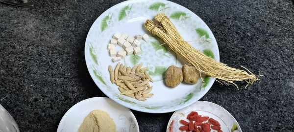 5、食材清洗好瞭,我們來弄一點剩料,三個人吃,兩小隻護肝草,麥冬,茯苓,兩顆蜜棗,花旗參粉。
